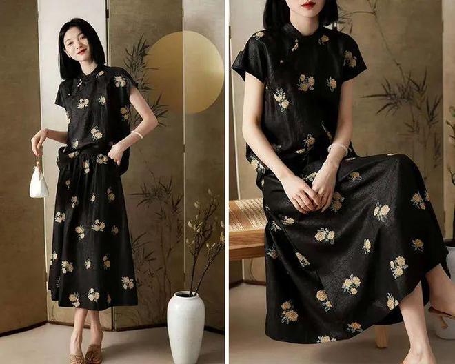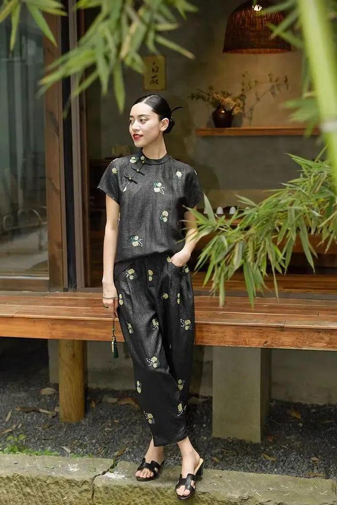 旗袍立领与斜襟盘扣的设计,保留了传统韵味。配套的香云纱裤行云流水,让整套造型多了些干练利落。