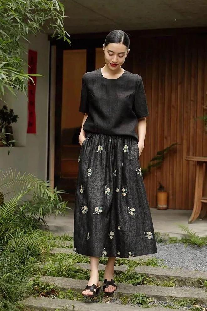 宽松飘逸的龟裂纹香云纱半身裙,绣球花点缀在纹理斑驳的底色上,古朴优雅,毫不费力就能穿出夏日午后的慵懒感。