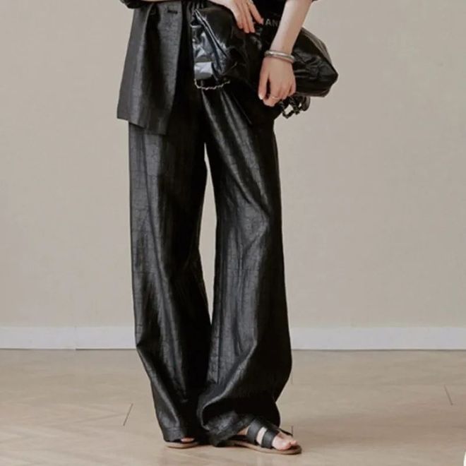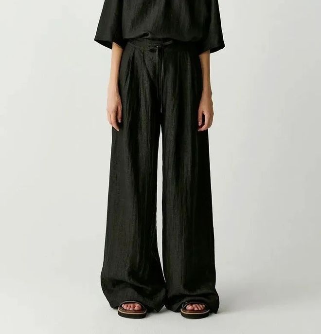 这条裤子因为底胚布主要以桑蚕丝为主,再加上10%醋酸纤维,所以穿在腿上滑溜溜的,而且垂坠感很好。