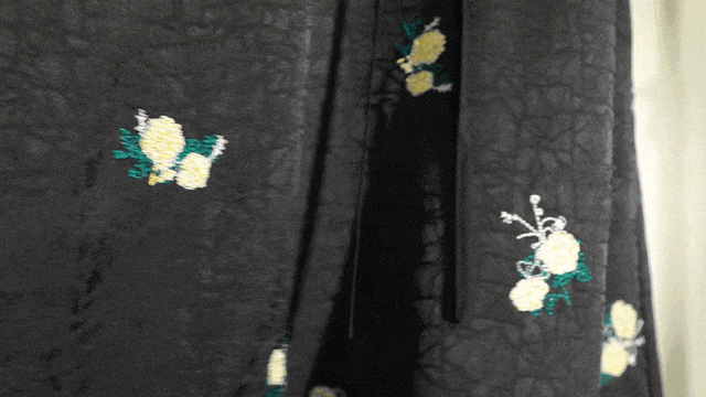 布料经过香云纱工艺处理,表面带有高级感满满的自然褶皱,摸上去却很丝滑,整体风格复古华丽却又时髦。