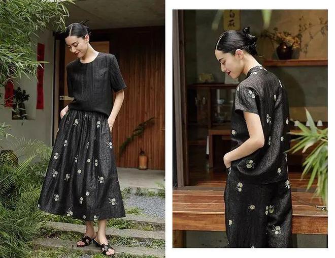 宽松飘逸的龟裂纹香云纱半身裙,绣球花点缀在纹理斑驳的底色上,古朴优雅,毫不费力就能穿出夏日午后的慵懒感。