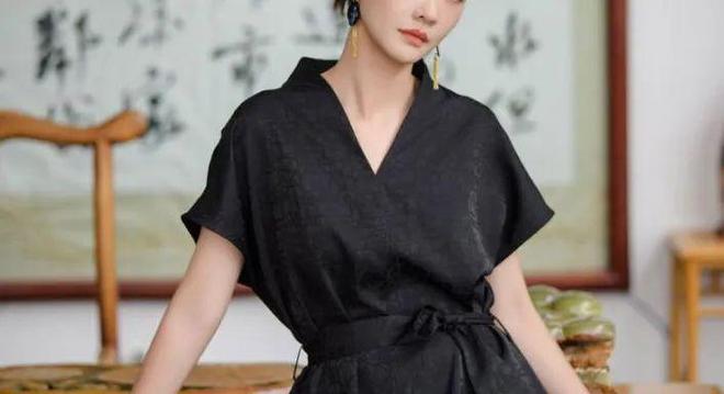 而香云纱V领连衣裙,垂坠的布料随步履轻晃,香云纱特有的沙沙声在衣摆间响起,宽松却不松垮的设计,让整件连衣裙松弛却质感满满。
