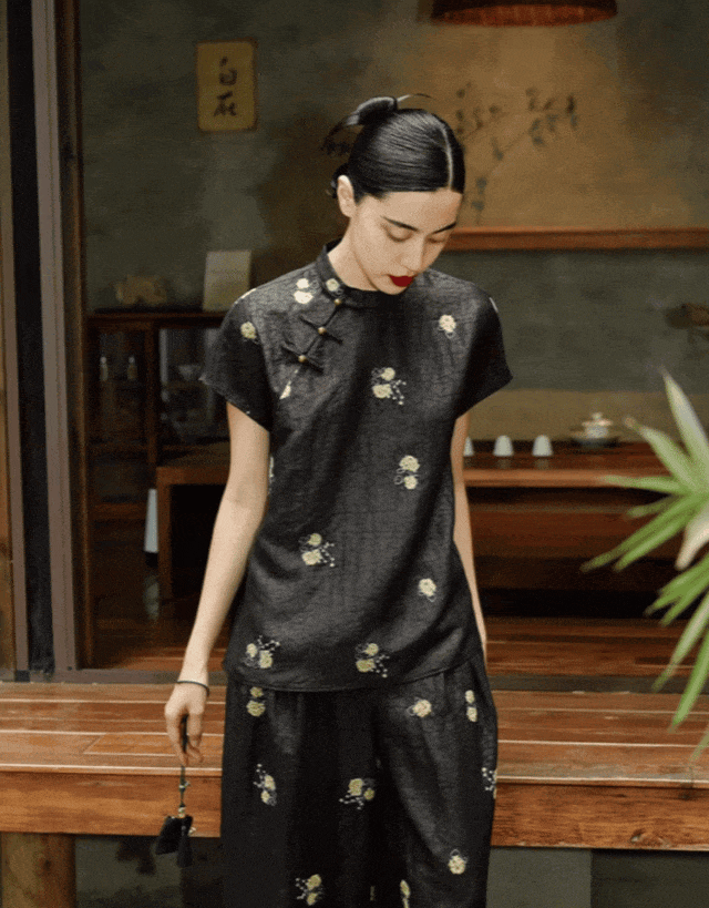 旗袍立领与斜襟盘扣的设计,保留了传统韵味。配套的香云纱裤行云流水,让整套造型多了些干练利落。