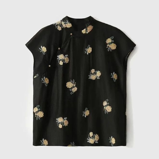 斜襟设计是这件中式上衣的“灵魂”。盘扣是金色卷草纹玲珑香囊样式,在黑色底色的衬托下格外雅致。