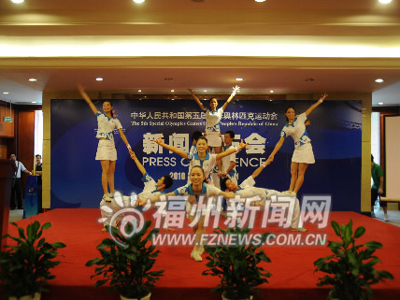 新闻发布会上,10名志愿者身穿志愿者服装上台表演。志愿者服饰的主体设计运用海浪、茉莉花以及本次特奥会标志等元素,蓝白相间,蓝色象征着海一般的包容,与同样干净的白色相结合,透出一股清新温和、大气舒适的气息以及浓厚的人文关怀。