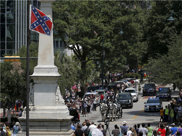 6月24日,一架马车载着遇难议员平克尼的棺木经过南卡州议会大厦前的邦联旗。图片来源:新华/路透