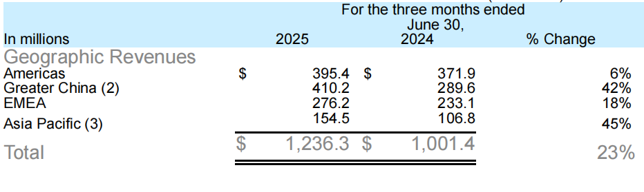 分地区来看,今年第二季度亚玛芬在大中华区展现出强劲势头,当季营收同比增长42%至4.1亿美元,收入规模超越北美市场。此前的第一季度,北美市场以0.19亿美元的微弱营收差距领先于大中华区市场;而第二季度,亚玛芬北美市场营收同比仅增长6%至3.95亿美元。此外,亚太地区(Asia Pacific)营收同比增长45%至1.55亿美元,增速排在首位;欧洲、中东和非洲地区(EMEA)营收达到2.76亿美元,同比增长18%。